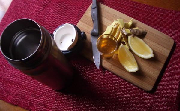 Maria's Favorite Immune Tea RecipeGinger Thermos Tea One of my main go-tos when I start to feel sick and have a sore throat. Spicy ginger and honey soothe sore throats and coughs, warm the body, break fevers, quell nausea, and boost