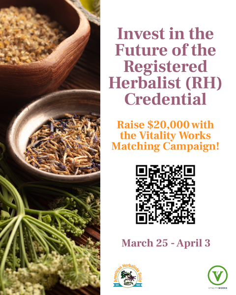 Help strengthen the path forward for the Registered Herbalist (RH) credential! The RH credential represents a standard of care, education, and responsibility within clinical herbalism. Today, we have an opportunity to reinforce that foundation for future practitioners. With matching support from Vitality Works and founder Mitch Coven, we have reached the halfway point of our $20,000 goal. All donations continue to be matched. We invite you to take part by contributing or sharing this effort. Donate here: https://www.zeffy.com/en-US/donation-form/open-the-registered-herbalist-rh-programÂ